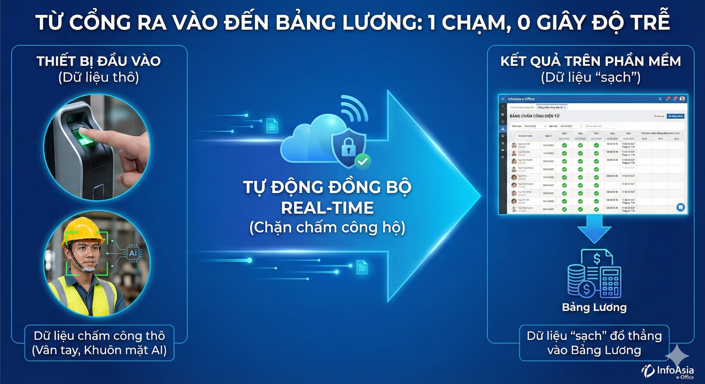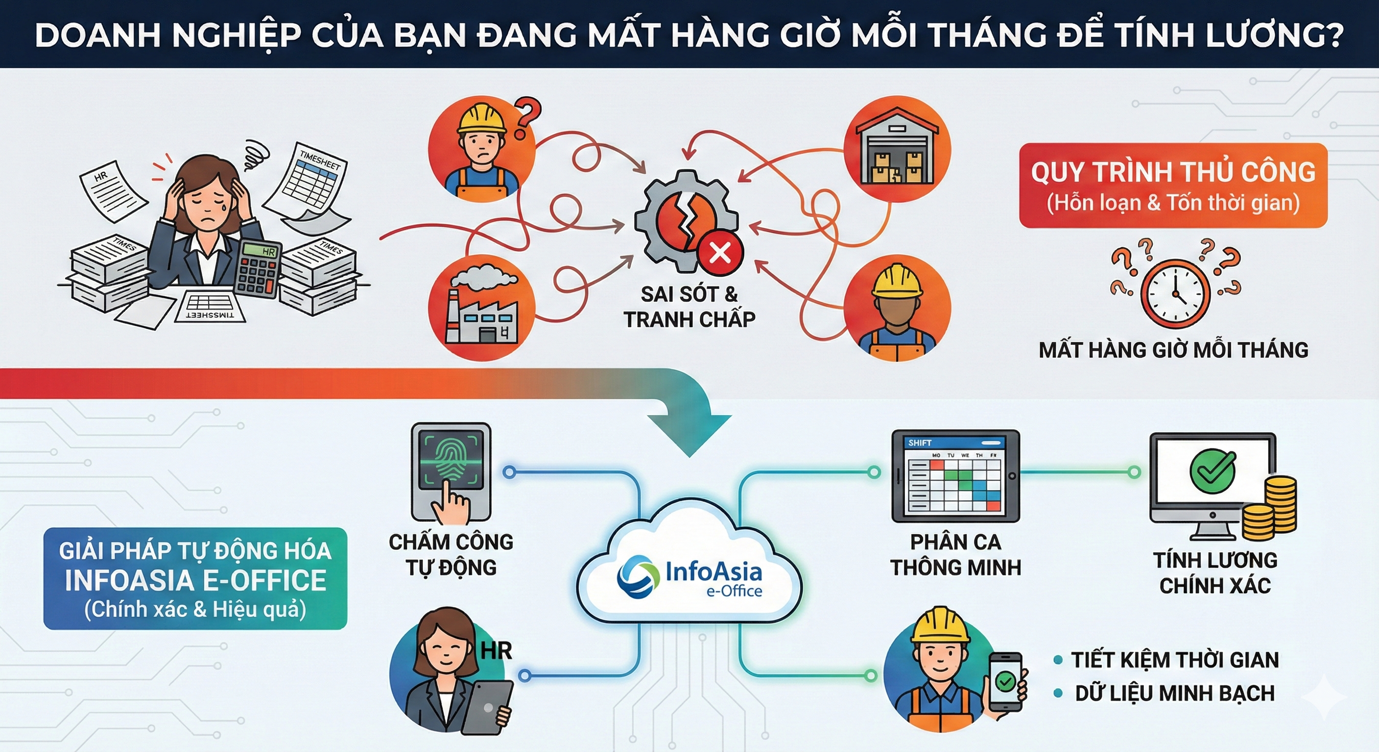 Trong môi trường sản xuất – kho vận – công trình, việc chấm công và tính lương thủ công luôn là nỗi ám ảnh của bộ phận nhân sự. Hàng trăm ca làm việc phức tạp, dữ liệu nhập tay, dễ sai sót và tranh chấp lương thưởng. Giải pháp chính là phần mềm nhân sự & tính lương InfoAsia e-Office – giúp tự động hóa toàn bộ quy trình chấm công, phân ca và tính lương.